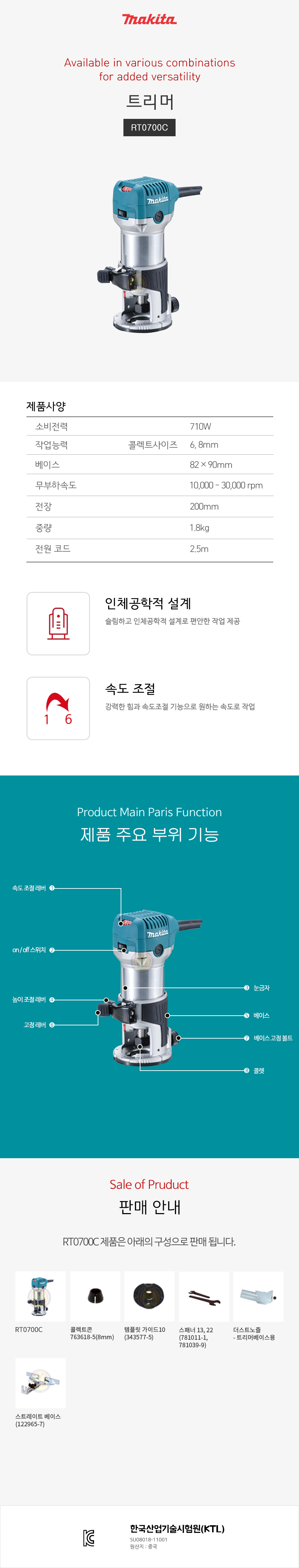 마끼다 트리머 RT0702C (콜렛 6, 8mm) 710W MAKITA, 오비탈샌더, 샌딩기, 사포기계, 공구몰