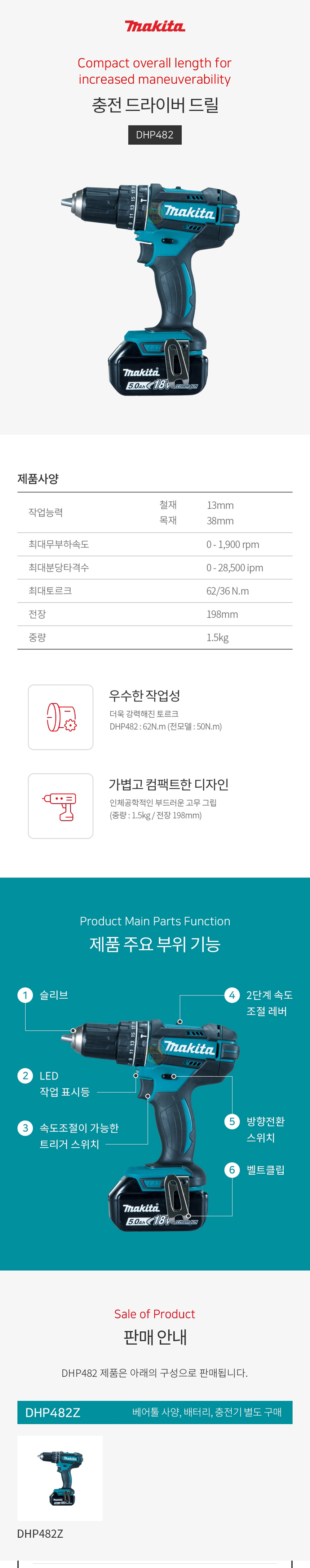 마끼다 18V 충전햄머드릴드라이버 DHP482Z (베어툴) 충전드릴 충전해머 햄머드릴 해머드릴