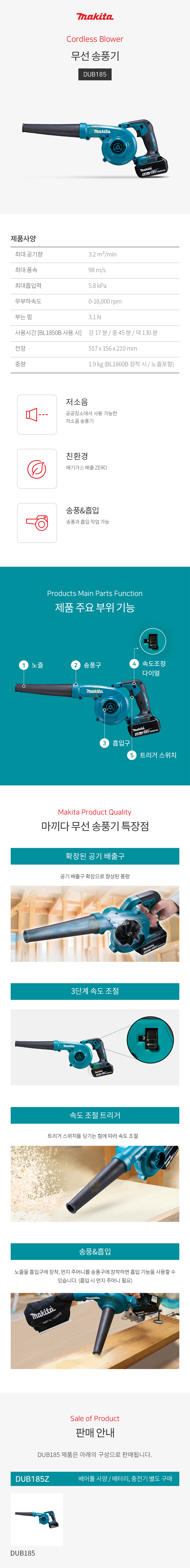 마끼다 18V 충전송풍기 DUB185Z (베어툴) 충전브로워 청소기 송풍기