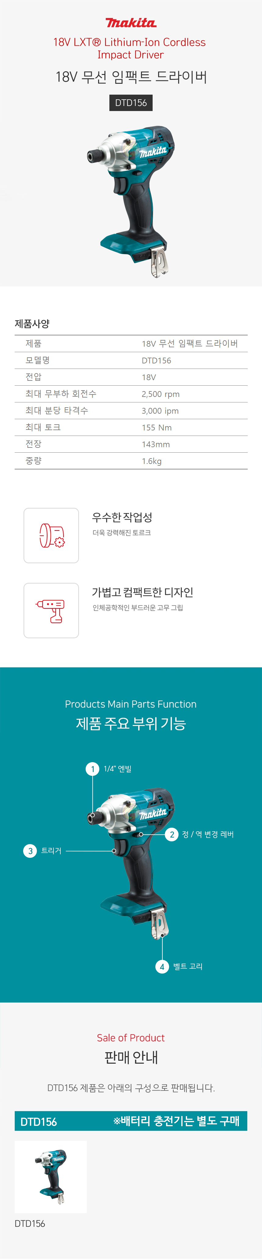 마끼다 18V 충전임팩드라이버 DTD156Z (베어툴) 충전임팩 임팩트드라이버 임팩드라이버