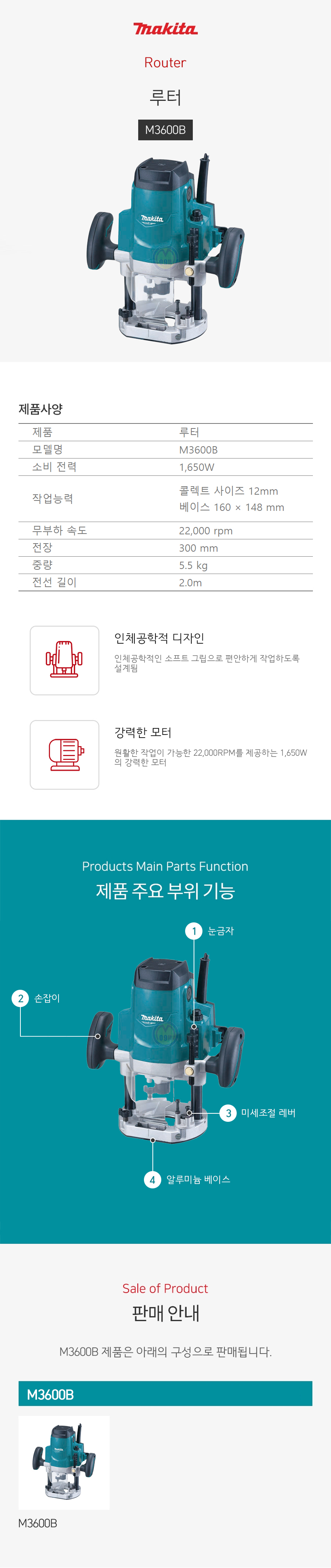 마끼다 루터 M3602B (콜렛 6/12mm) 1,650W MAKITA, 라우터, 트리머, 루타기, 공구몰