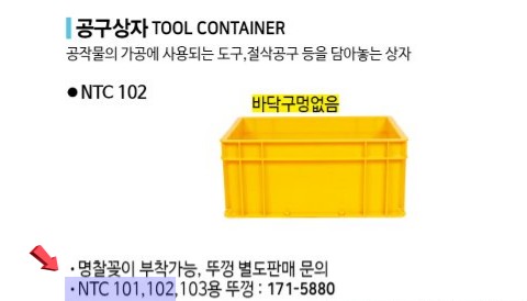 NTC 103 * 내용량/27ℓ * 외 부/445X273X300 * 내 부/410X243X292 * 압축하중/1,800kg * 내하중/35kg * 원료/PE H/D,PPC * 뚜껑 별도판매 가능 (반드시 별도문의)