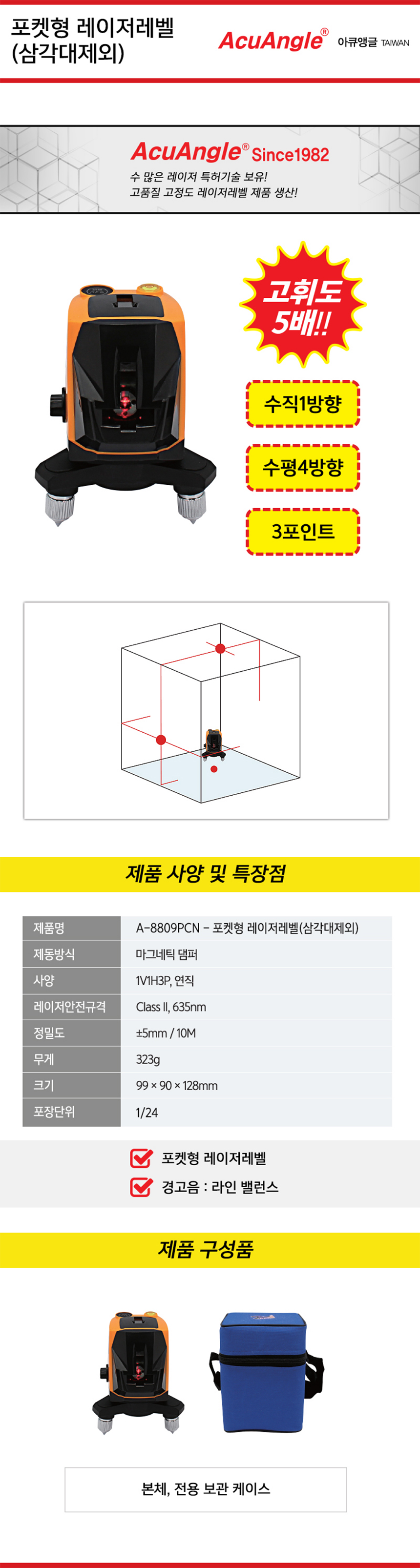 아큐앵글 레이저레벨기 A-8809PCN (수직1 수평1 3포인트) 아큐앵글, 수평계