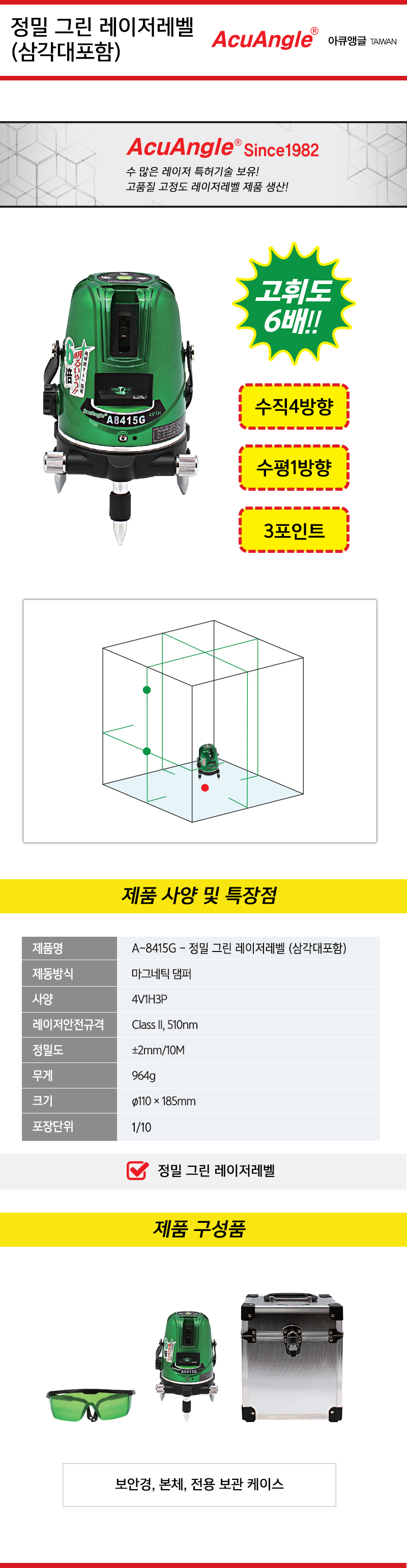 아큐앵글 그린 레이저레벨기 A-8415J (삼각대포함) 4V1H, 6포인트, 아큐앵글, ACUANGLE