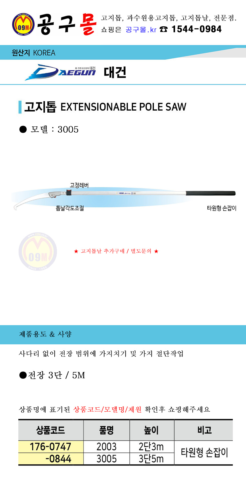 고지톱 2003/3005 (2단-3M/3단-5M) DAEGUN/대건,가지치기톱, 공구몰 ,176-0747
