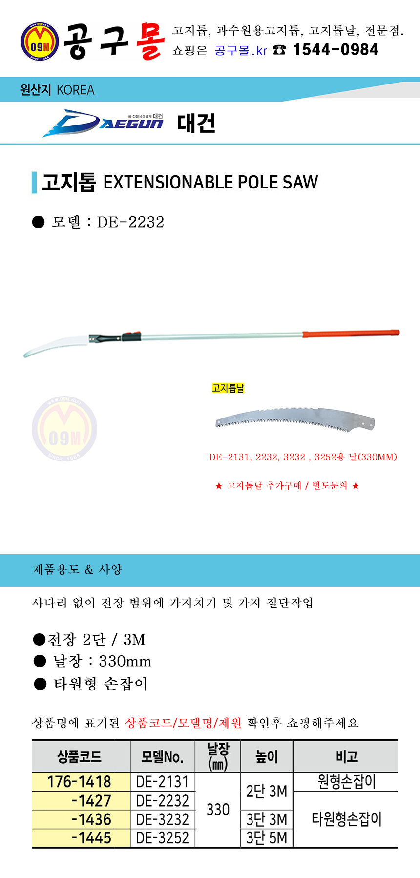 고지톱 2003/3005 (2단-3M/3단-5M) DAEGUN/대건,가지치기톱, 공구몰 ,176-0747