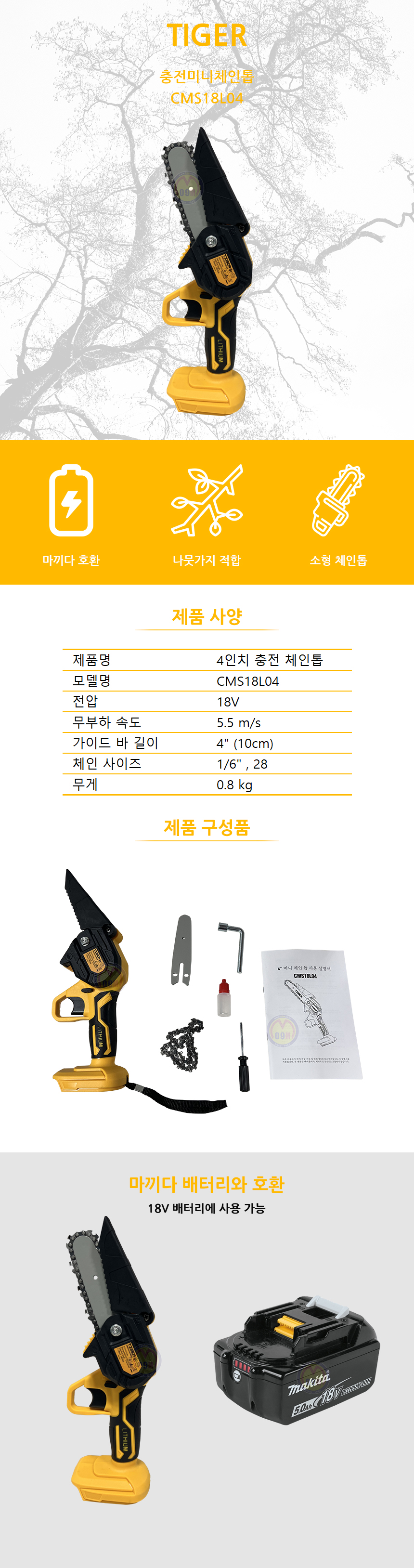 타이거 충전미니체인톱 CMS18L04 (베어툴) 100mm 체인톱 충전톱 미니톱