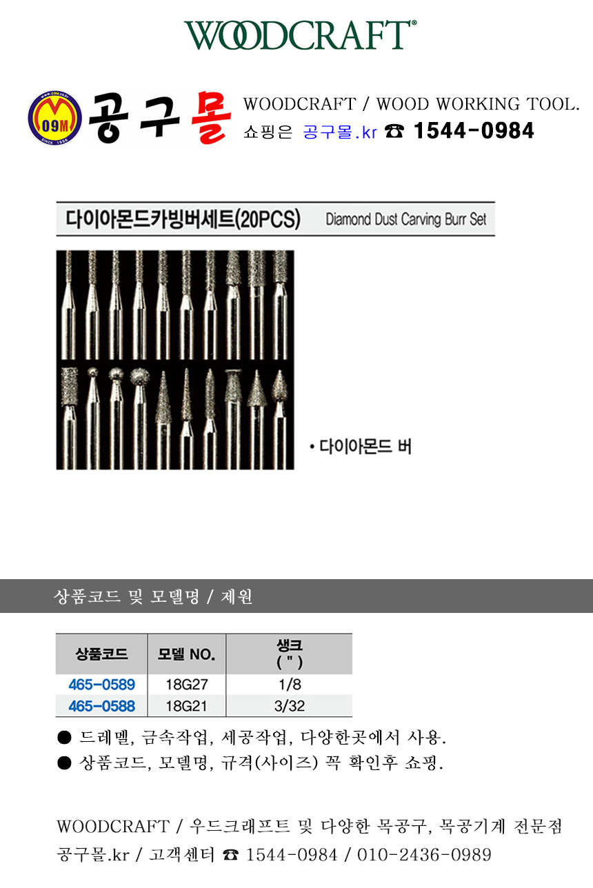 다이아몬드 카빙버세트(20P) 18G27, 465-0589, 3/32,WOODCRAFT, 드레멜용, 우드크래프트, 카빙버