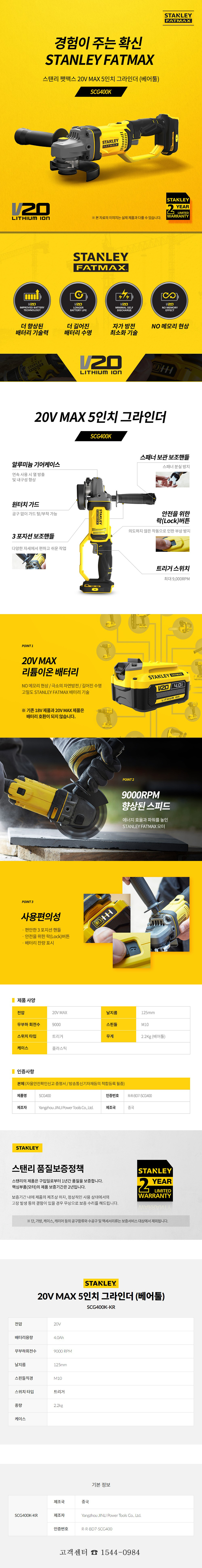 (스탠리) 20V MAX (5)125mm 그라인더(베어툴) SCG400K-KR STANLEY,충전그라인더,