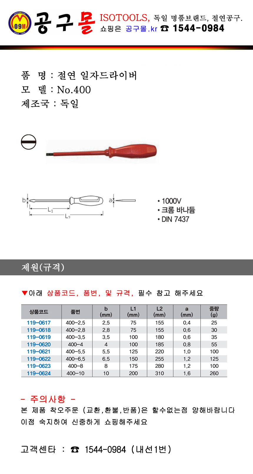 ISOTOOLS 절연일자드라이버 400-10(No.400) 독일, 절연공구, 절연드라이버,119-0624