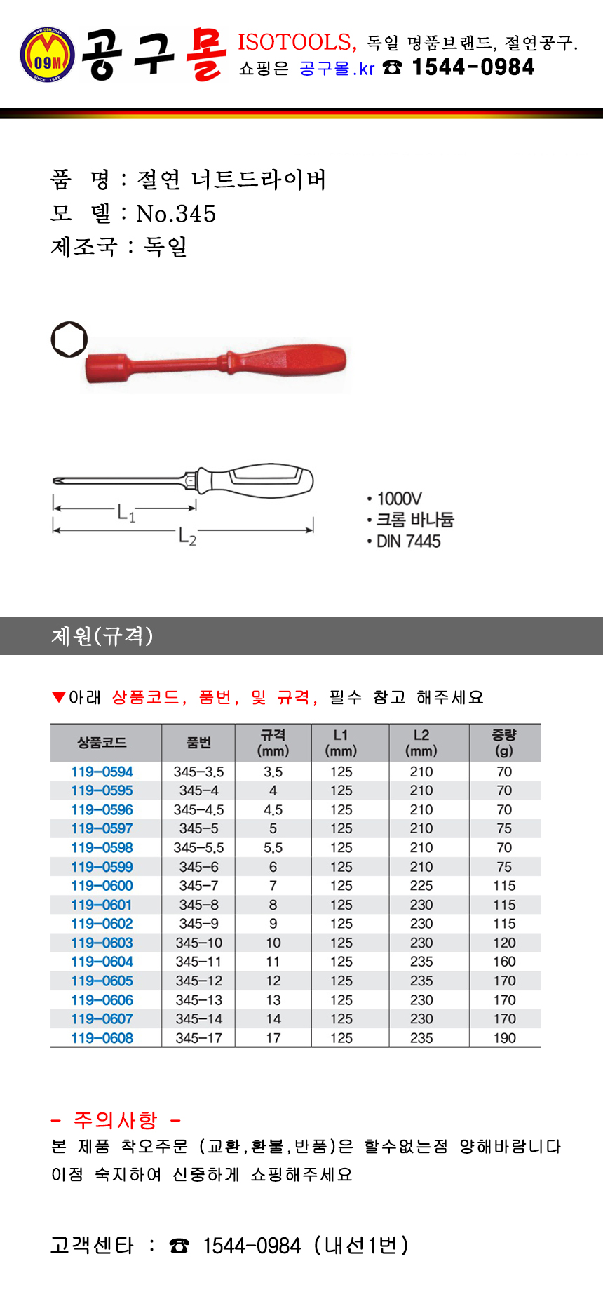 ISOTOOLS 절연너트드라이버 345-7 (No.345) 7mm 독일, 절연공구, 절연드라이버,119-0600