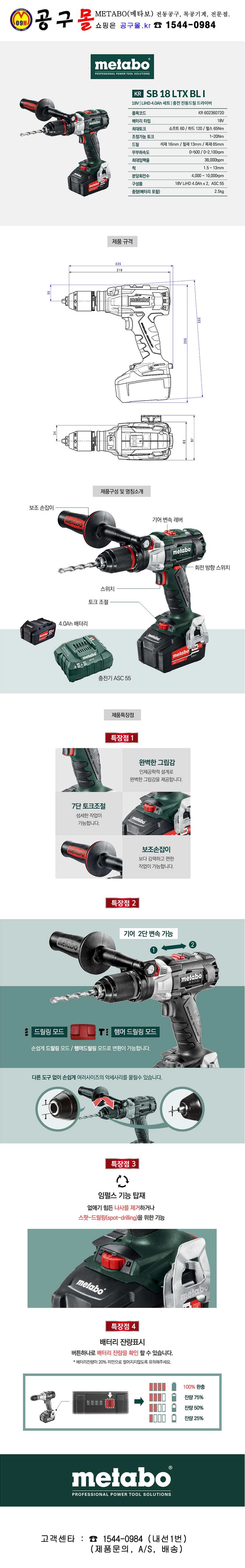 메타보 충전진동드릴(BL) SB 18 LTX BL I (18V, 4Ah,2B) METABO, 해머드릴, 함마드릴,공구몰, 602360720