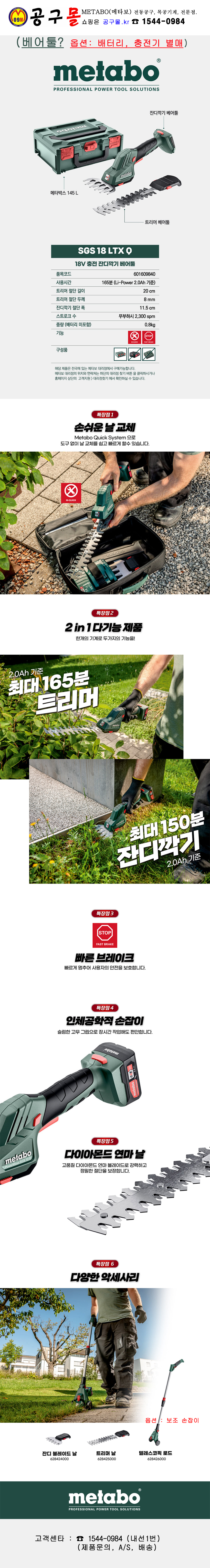 메타보 충전잔디깍기(트리머포함) SGS 18 LTX Q(베어툴) 전정기, METABO, 공구몰, 601609840