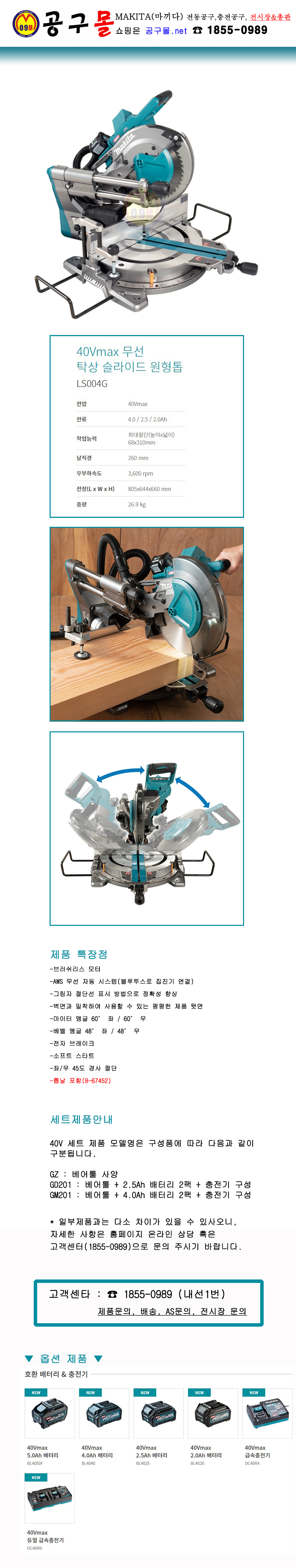 마끼다 40V 슬라이드 원형톱(베어툴) LS004GZ 260mm, 날포함, 40Vmax MAKITA,각도절단기, 인테리어톱, 공구몰