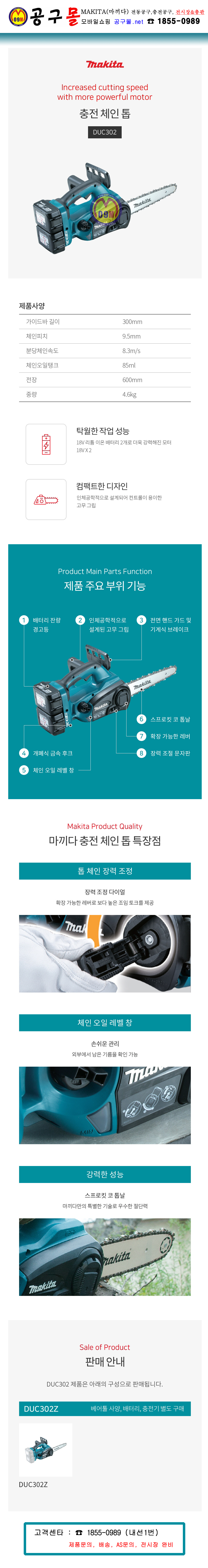 마끼다 18Vx2 체인톱 DUC302Z (베어툴) 300mm, MAKITA, 충전체인톱, 체인톱, 무선톱, 충전톱, 공구몰