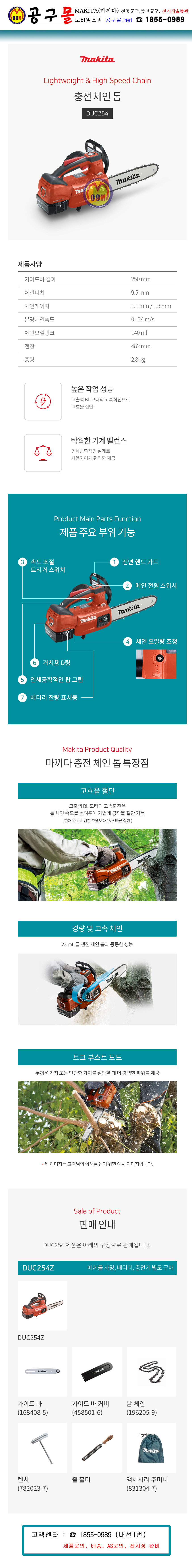 마끼다 18V 체인톱 DUC254ZBR (베어툴) 250mm, MAKITA, 충전체인톱, 체인톱, 무선톱, 충전톱, 공구몰