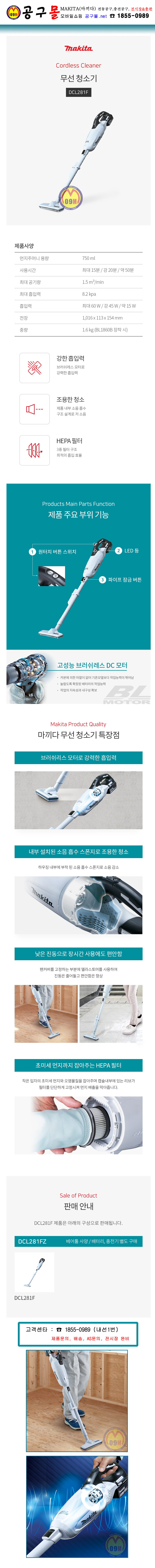 마끼다 18V 청소기 DCL281FZW (베어툴) (BL) MAKITA, 터치스위치, 먼지주머니, 공구몰