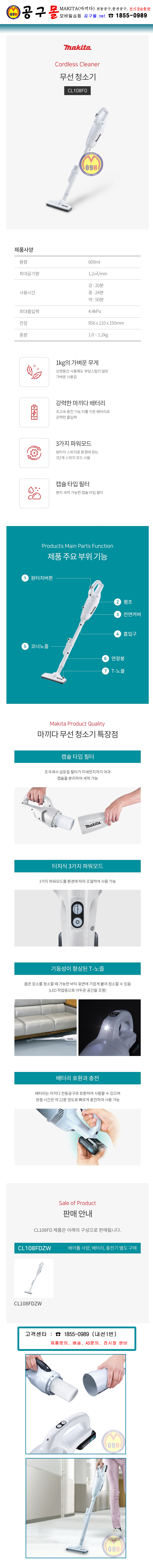 마끼다 12V 청소기 CL108FDZW (베어툴) MAKITA, 원터치 스위치, 종이 / 천 먼지주머니, 공구몰