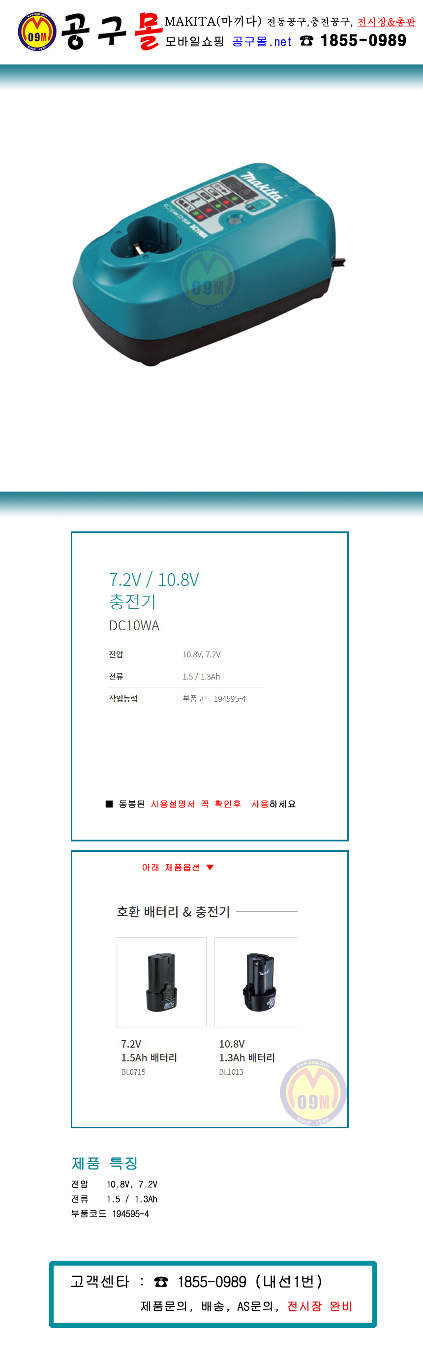 마끼다 충전기 DC10WA (7.2V / 10.8V) 194595-4, MAKITA, (BL1013/ 632H95-9), 공구몰