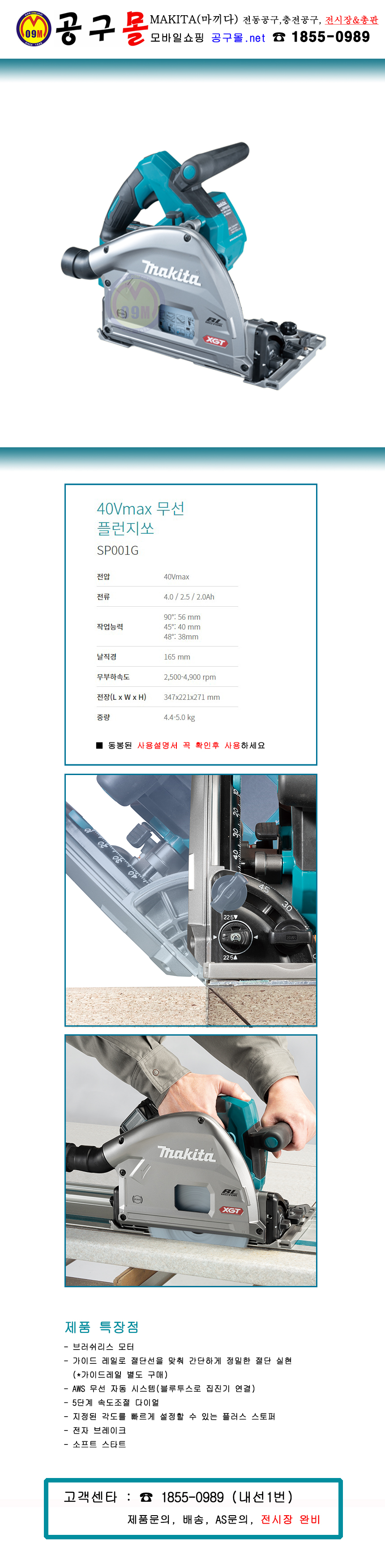 품절.마끼다 40V 플런지쏘 SP001GZ02 (베어툴) 165mm (BL, AWS) MAKITA, 공구몰,충전원형톱, 원형톱, 무선톱
