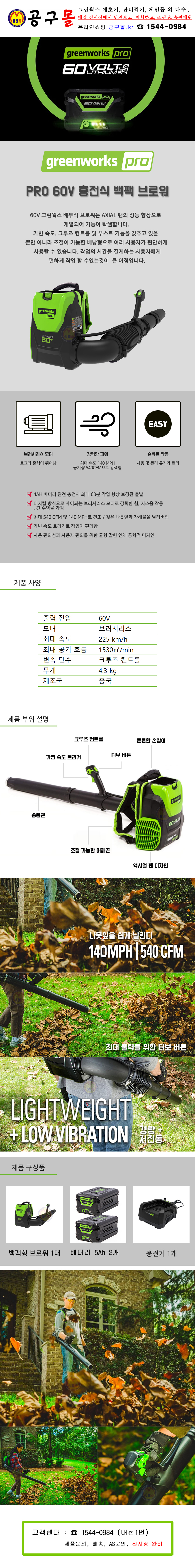 그린웍스 60V 473 엑시얼브로워 (5Ah1개 세트) 송풍기, 납엽청소기, 마당청소