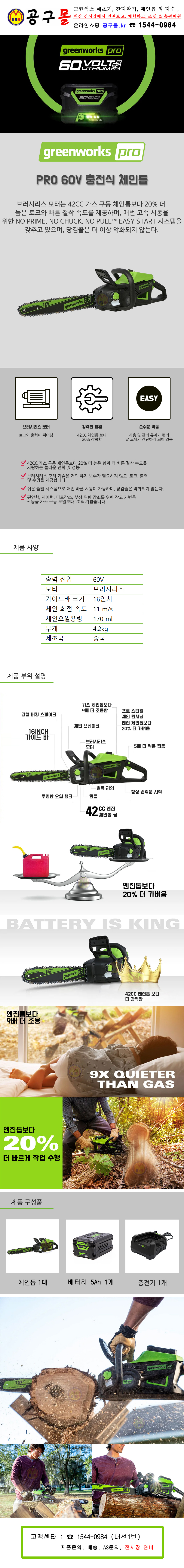 그린웍스 60V 973 체인톱 (5Ah1개 세트) 무선, 전기, 체인쏘, 공구몰