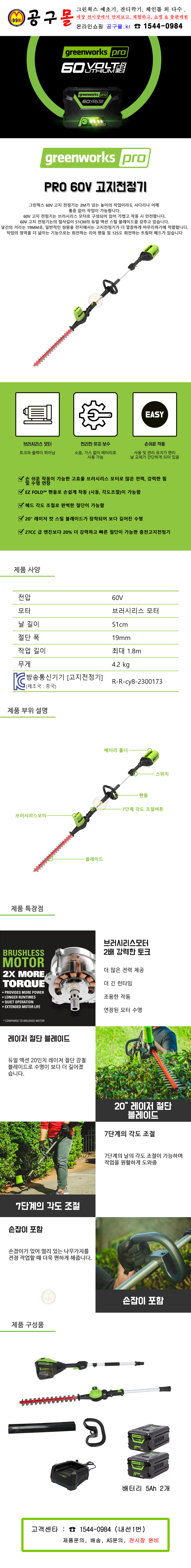 그린웍스 60V 173 고지전정기 (5Ah2개 세트) 충전고지전정기 전정기 트리머 고지트리머