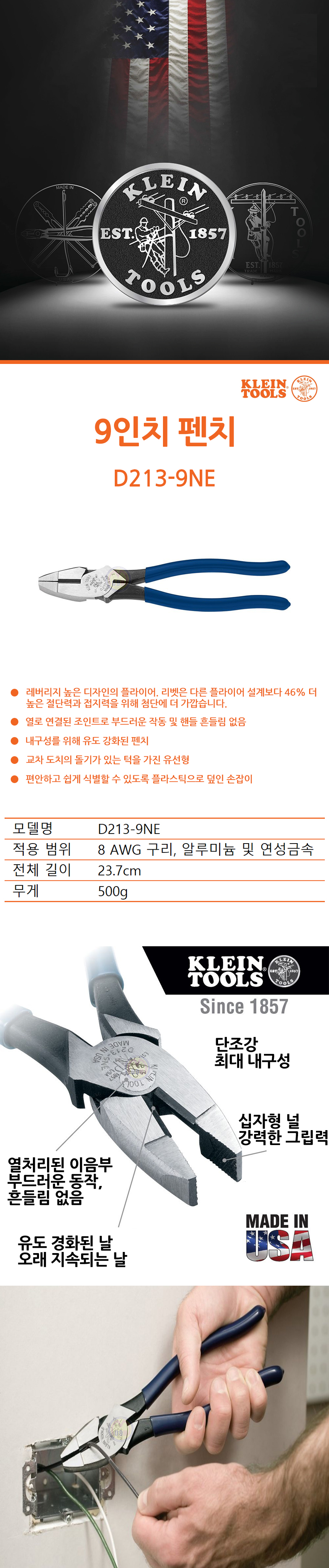 클라인툴스 9 펜치 D213-9NE, KLEIN, 뺀치 미국제공구