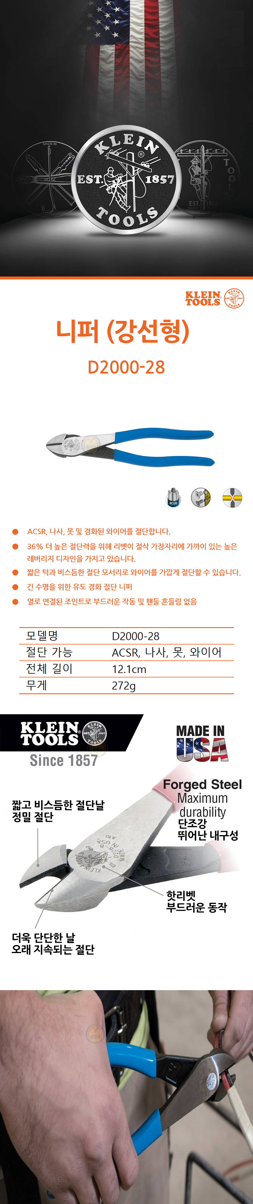 클라인툴스 니퍼 (강선형) D2000-28, KLEIN, 곡선니퍼 뺀치 플라이어