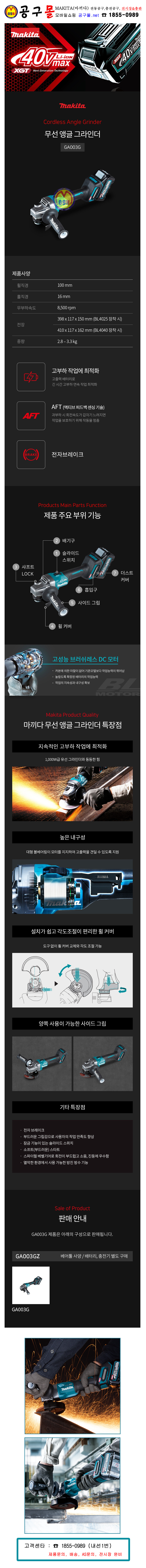 마끼다-40V 앵글그라인더(4) GA003GZ (베어툴) (BL, 슬라이드 S/W) MAKITA, 공구몰, 디스크그라인더, 충전그라인더.