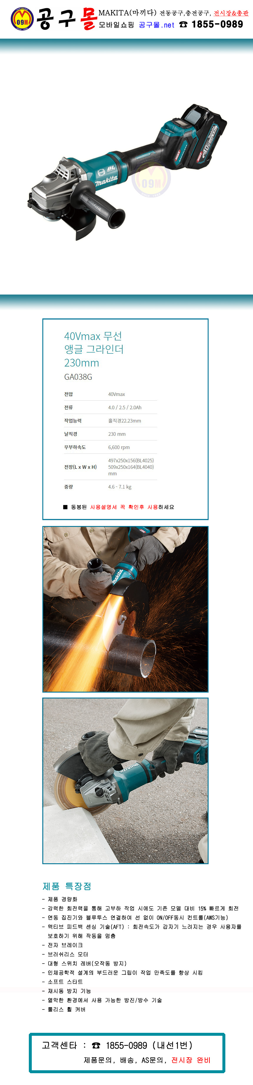 마끼다 40V 앵글그라인더(9) GA038GZ (베어툴) (BL, AWS, 패들S/W) MAKITA, 공구몰, 디스크그라인더, 충전그라인더.