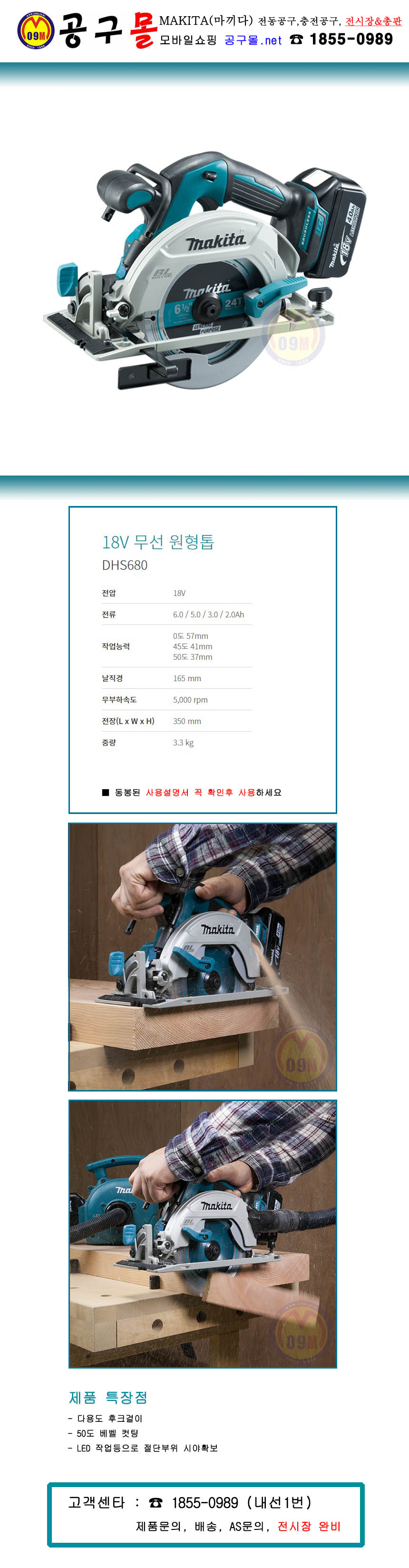 마끼다 18V 원형톱 DHS680Z (베어툴) 165mm (BL) MAKITA, 공구몰, 충전원형톱, 전기톱, 목재톱