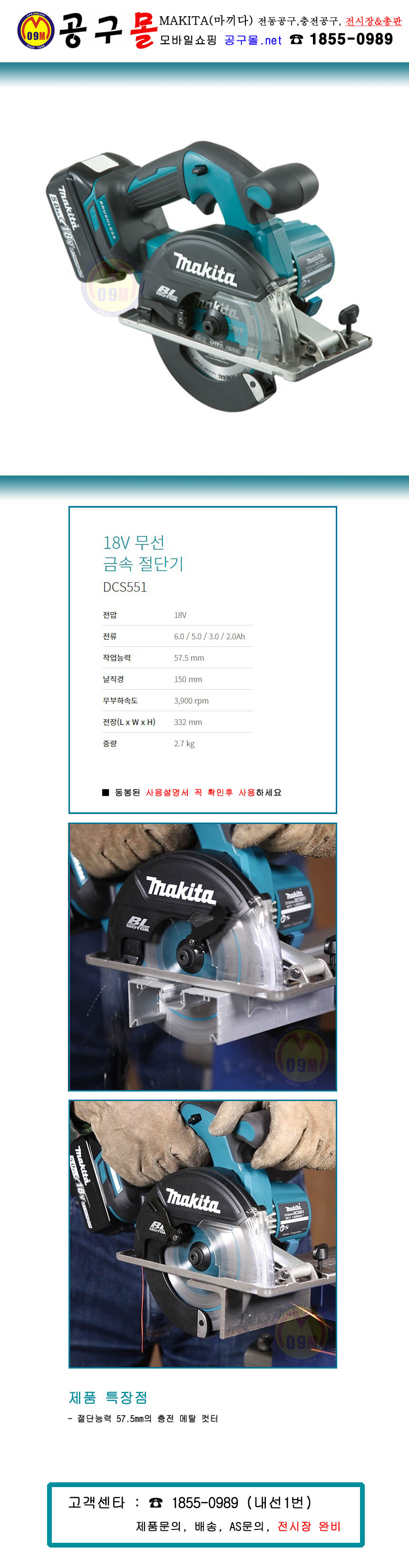 마끼다 18V 금속절단기 DCS551Z (베어툴) 150mm (BL) MAKITA, 공구몰, 앵글절단기, 파이프절단기.