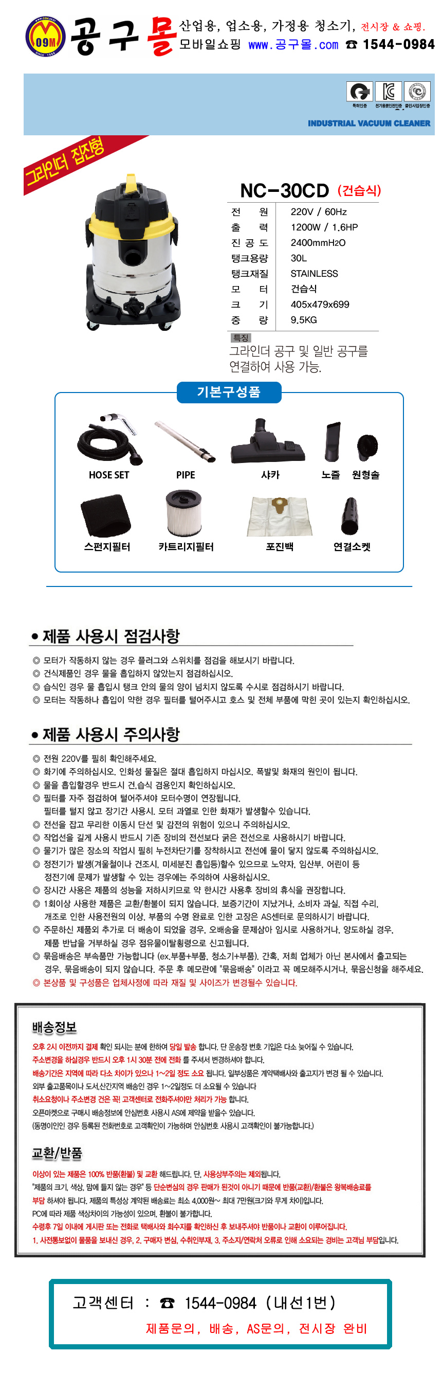 엔케이인더스 건습식청소기 NC-30CD(연동형) 1200W, 1모터/20L,건식청소기, 습식청소기,공구몰