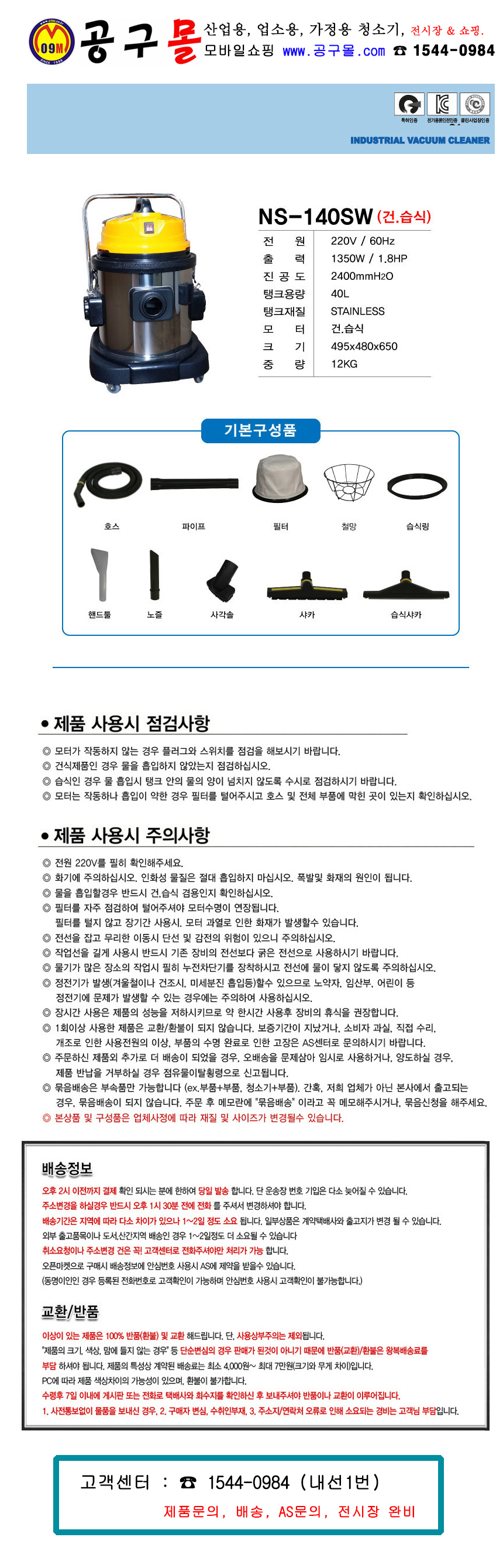 엔케이인더스 건습식청소기 NS-140SW 1350W,1모터/40리터,건식청소기, 습식청소기,공구몰
