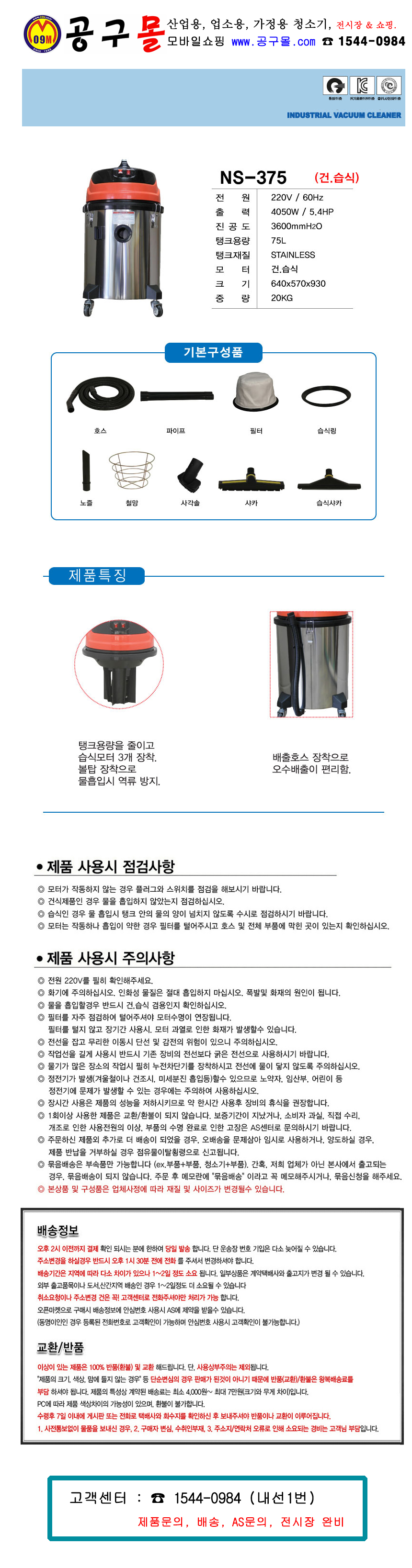 엔케이인더스 건습식청소기 NS-375W 4050W 3모터/75L, 물흡입시 역류방지, 오배수배출 편리함, 건식청소기, 습식청소기,공구몰