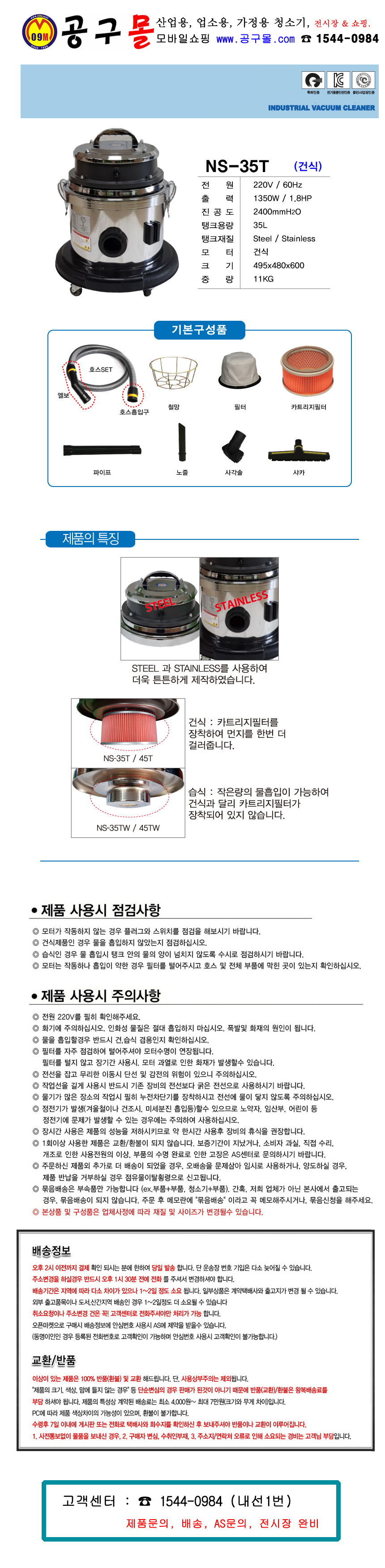 엔케이인더스 건식청소기 NS-35T 1350W 1모터, 35L, 진공청소기, 업소용청소기,공구몰