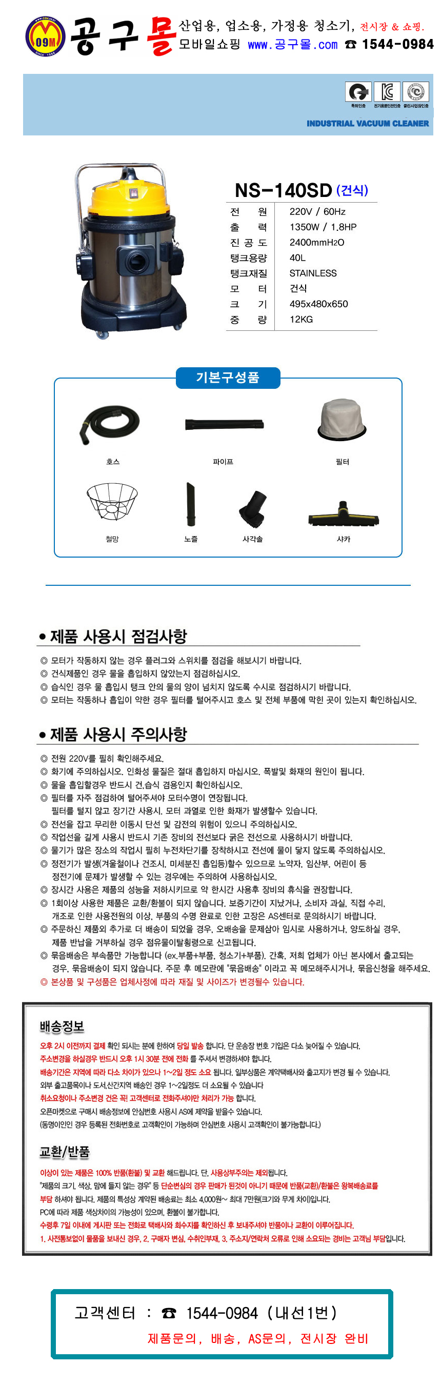 엔케이인더스 건식청소기 NS-140AS 1350W 1모터/ 40L, 강력한흡입력, 진공청소기, 업소용청소기,공구몰