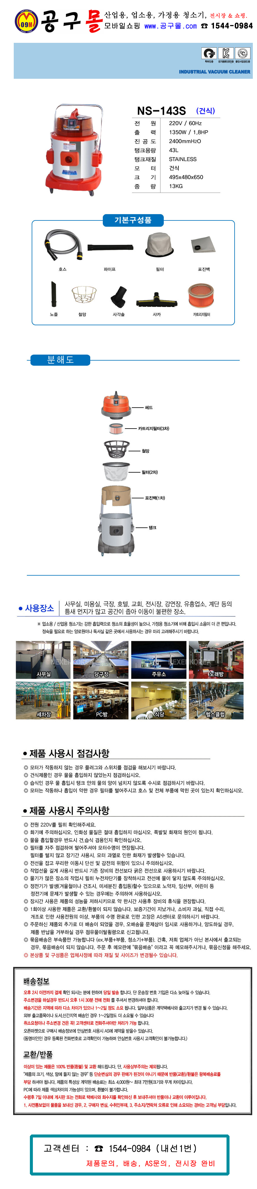 엔케이인더스 건식청소기 NS-143S 1350W 1모터/ 43L, 카트리지필터장착, 진공청소기, 업소용청소기,공구몰
