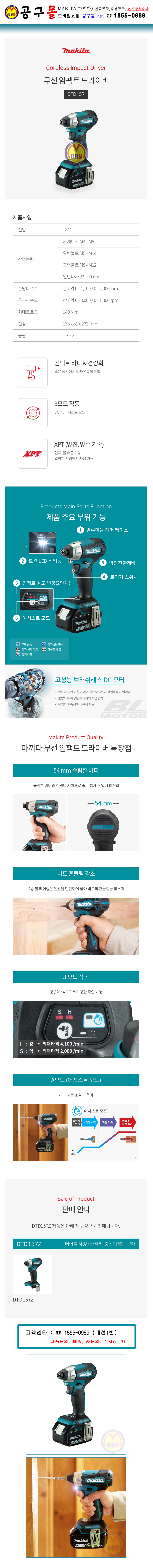 마끼다 18V 임팩드라이버 DTD157Z (베어툴) (BL) MAKITA, 충전임팩드라이버, 충전드라이버, 공구몰