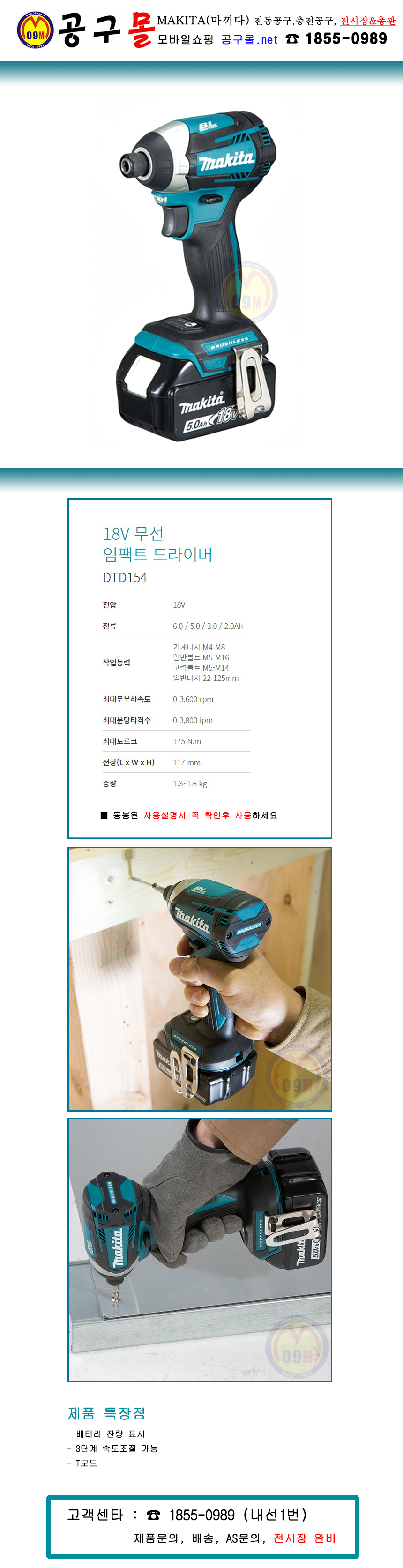 품절.마끼다 18V 임팩드라이버 DTD154Z (베어툴) (BL) MAKITA, 충전임팩드라이버, 충전드라이버, 공구몰  품절