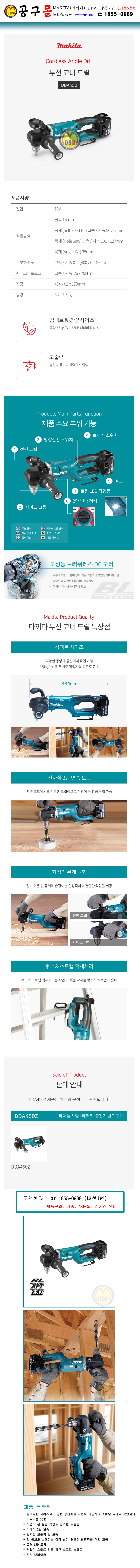 마끼다 18V 코너드릴 DDA450Z (베어툴) (키척, BL) 26N.m MAKITA, 충전코너드릴, 충전드릴, 공구몰