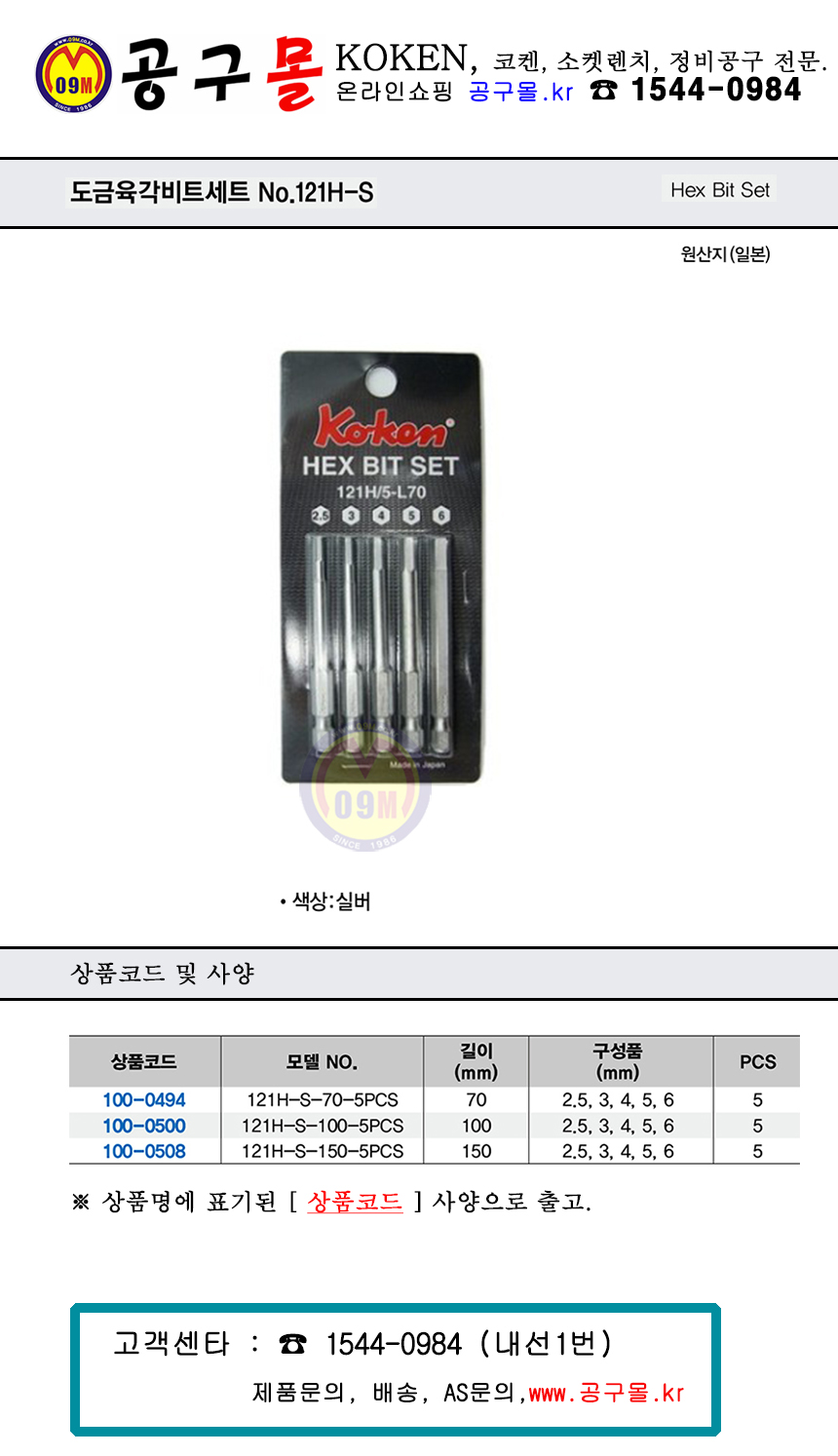 코켄 육각 파워비트세트 121H-S-150-5PCS KOKEN, 6각비트, 육각비트, L렌치,100-0508