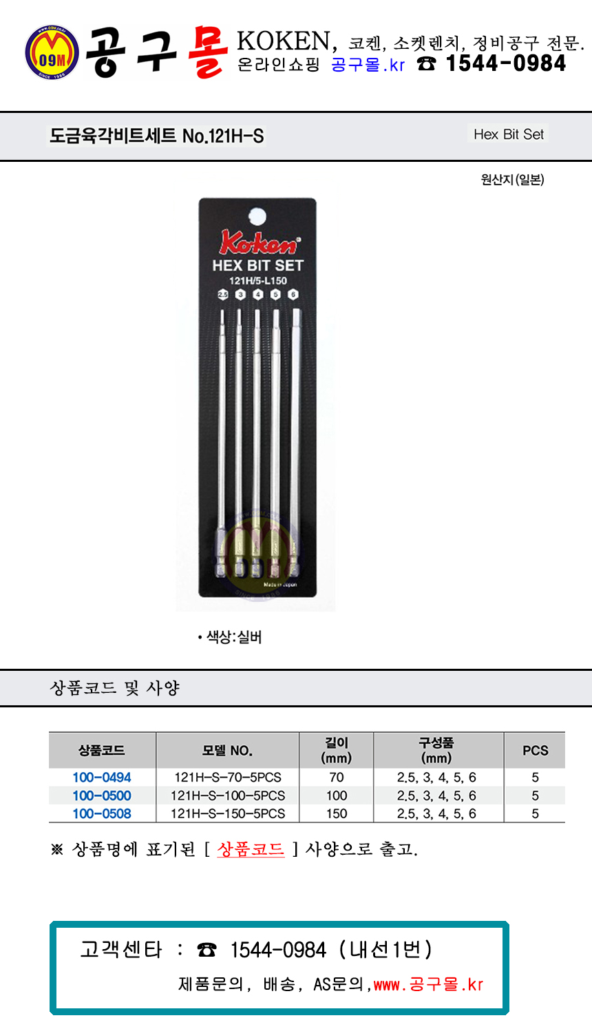 코켄 육각 파워비트세트 121H-S-150-5PCS KOKEN, 6각비트, 육각비트, L렌치,100-0508