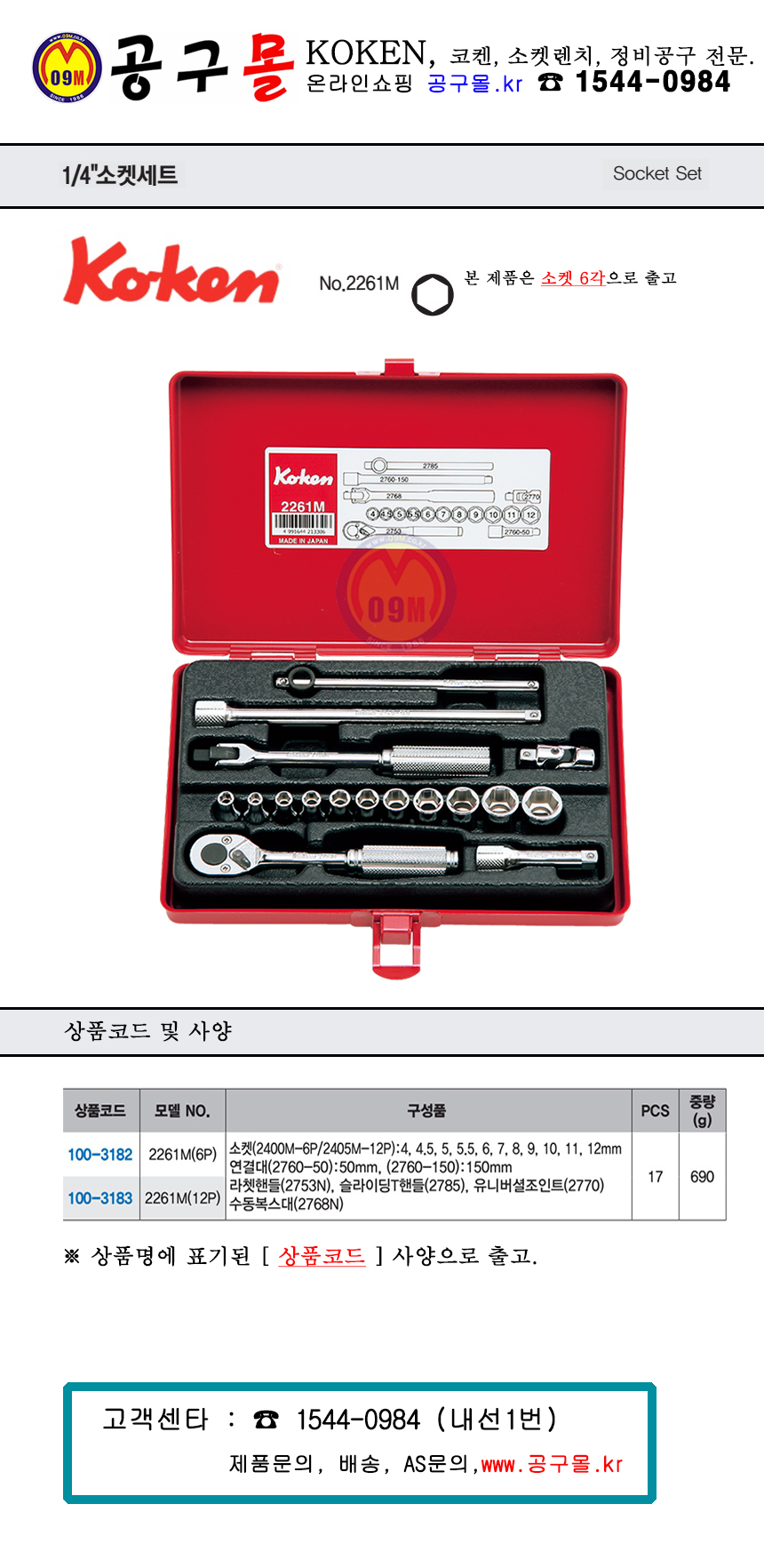 코켄 소켓세트(1/4-12각) 2261M-12P(17PCS) 2405M, KOKEN, 복스세트, 소켓세트,100-3183