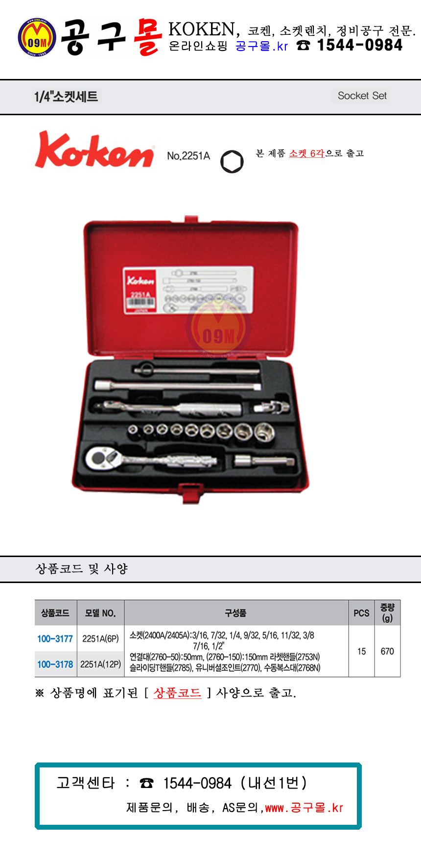 코켄 소켓세트(1/4-6각) 2251A-6P(15PCS) 2400A, KOKEN, 복스세트, 소켓세트,100-3177