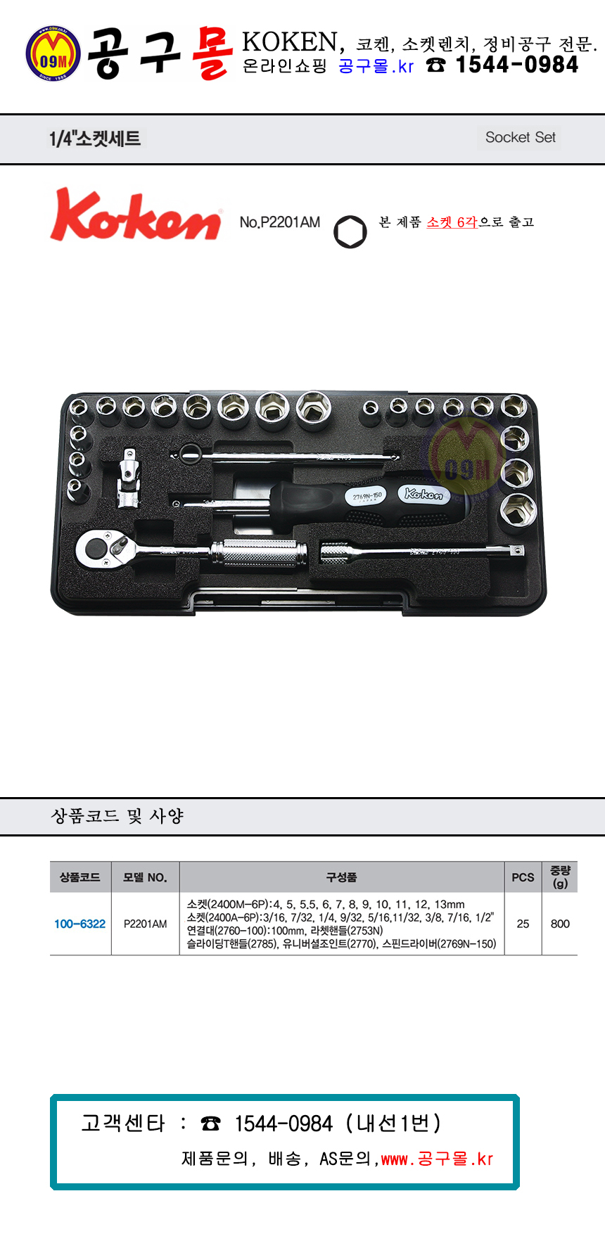 코켄 소켓세트(1/4-6각) P2201AM-6P (25PCS) 2400M, KOKEN, 복스세트, 소켓세트,100-6322