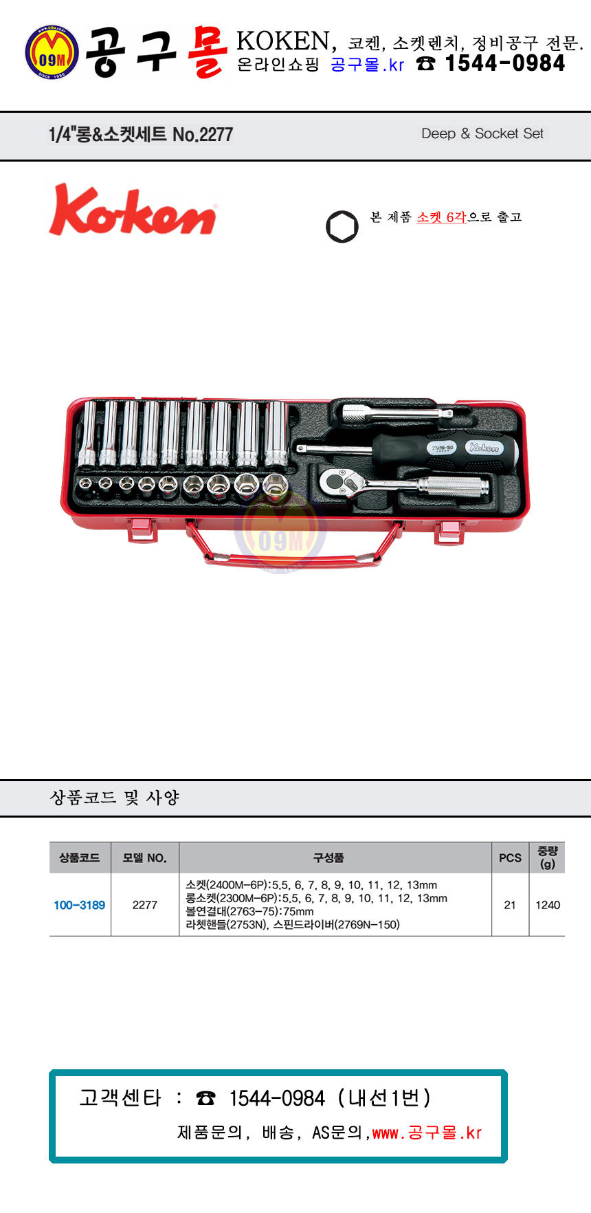 코켄 롱n소켓세트(1/4-6각) 2277M-6P (21PCS) 2400M, KOKEN, 롱복스세트, 롱소켓세트,100-3189