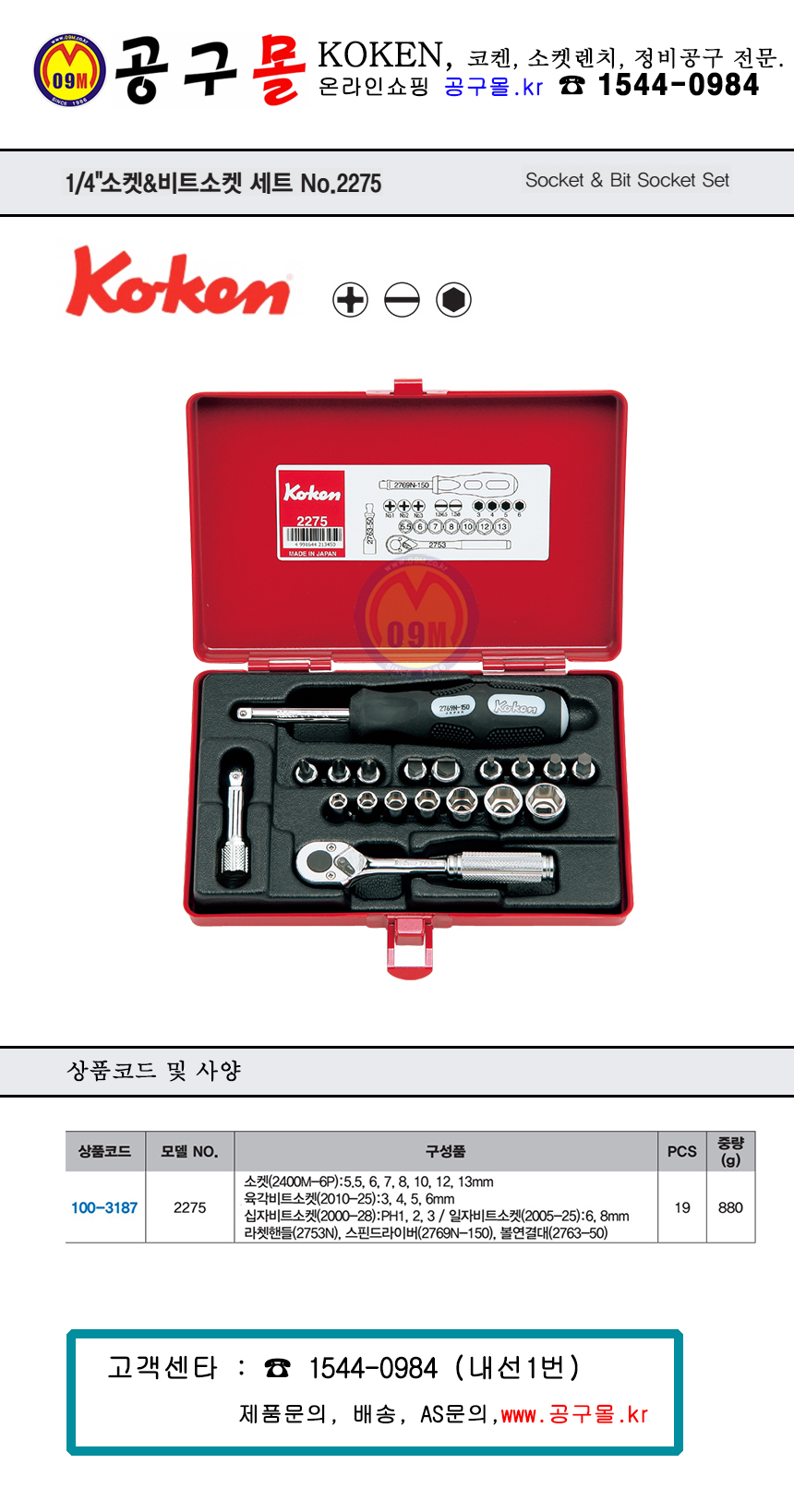 코켄 소켓&비트소켓세트(1/4-6각) 2275M-6P (19PCS) 2400M, KOKEN, 복스세트, 소켓세트,100-3187