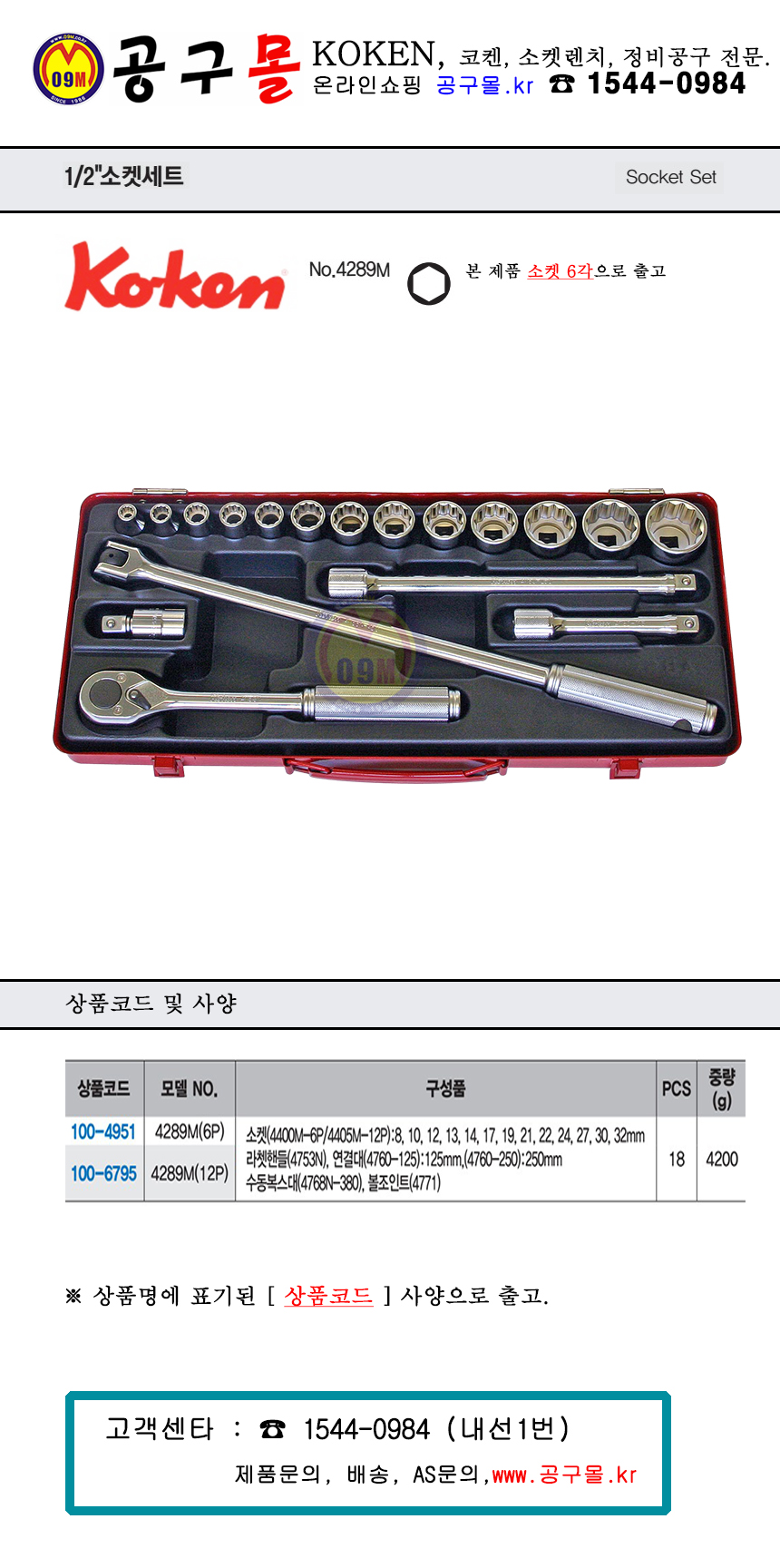 코켄 소켓세트(1/2-6각) 4289M-6P (18PCS) 4400M, KOKEN, 복스세트, 소켓세트,100-4951